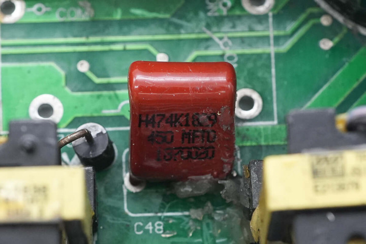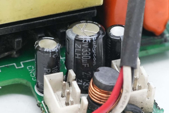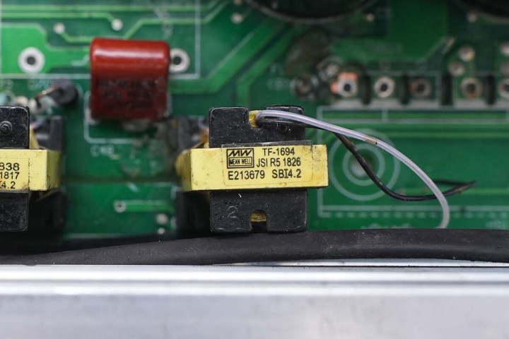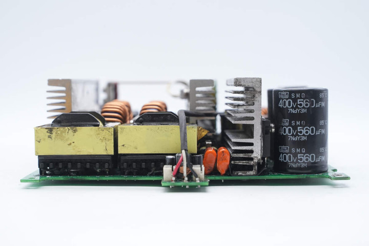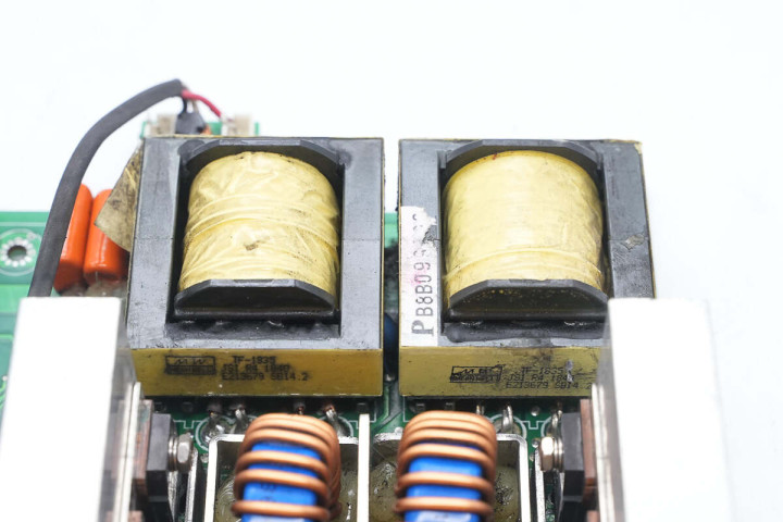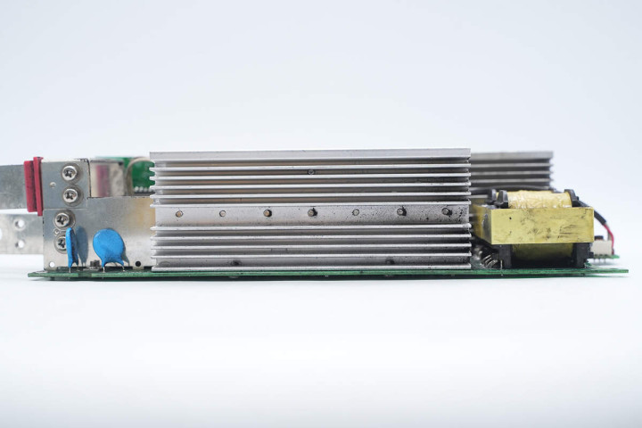 另一侧设有开关变压器,开关管散热片和高压滤波电容。