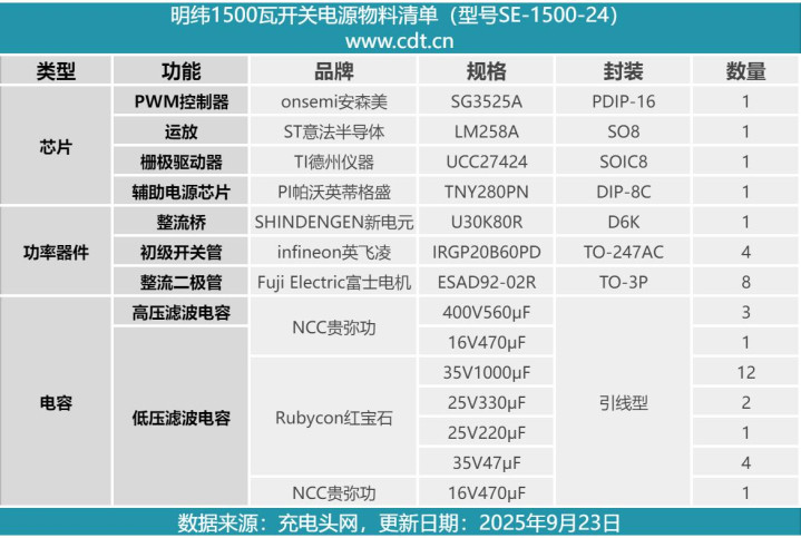 最后附上明纬1500W开关电源的核心物料清单,方便大家查阅。
