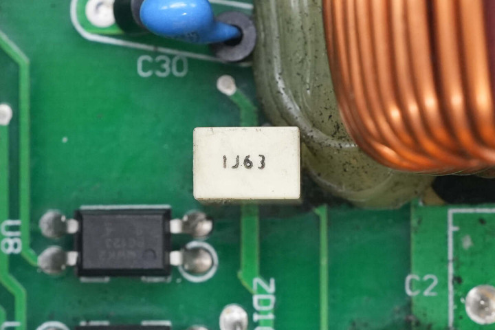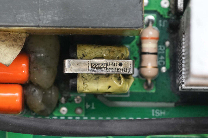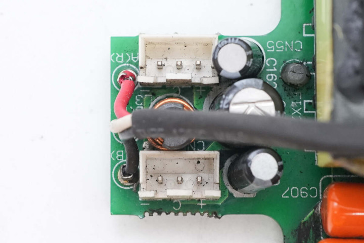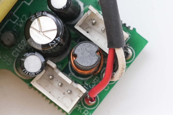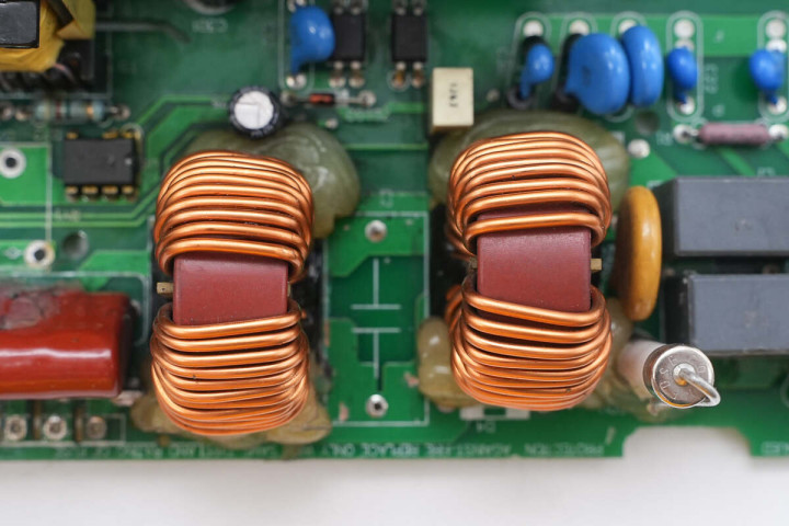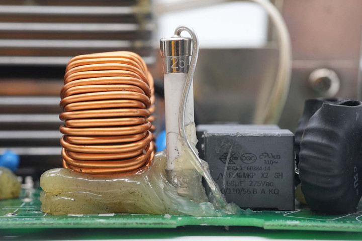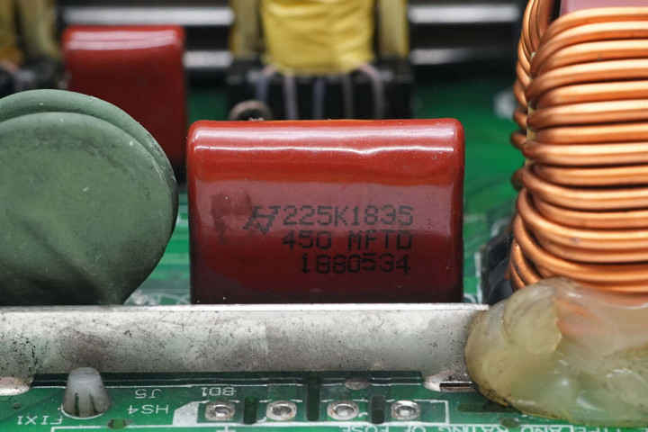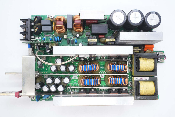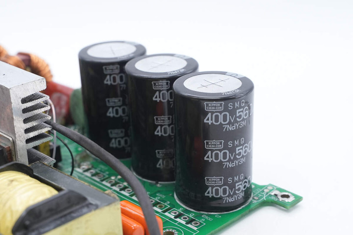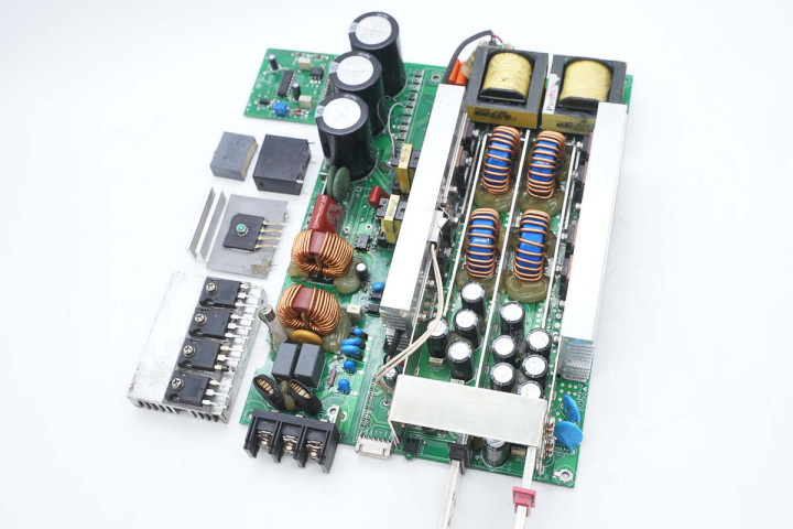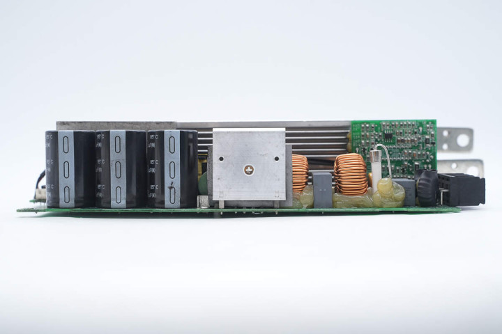另一侧设有滤波电感,保险丝,共模电感,整流桥和整流桥散热片,高压滤波电容。