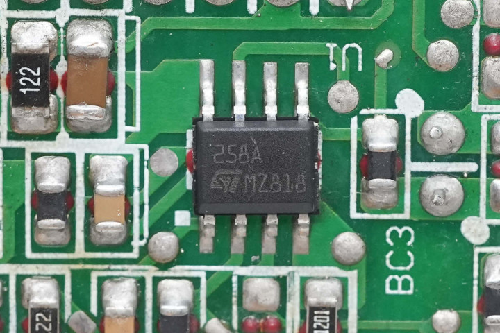 运放来自意法半导体,型号LM258A,是一颗低功耗双运算放大器,采用SO8封装。