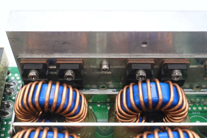 开关管下方设有变压器,左侧设有整流二极管,汇流铜排和散热片,中间设有滤波电感,左侧设有滤波电容和直流输出接线柱。左侧交流输入端和直流输出接线柱之间设有控制小板。