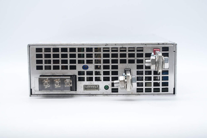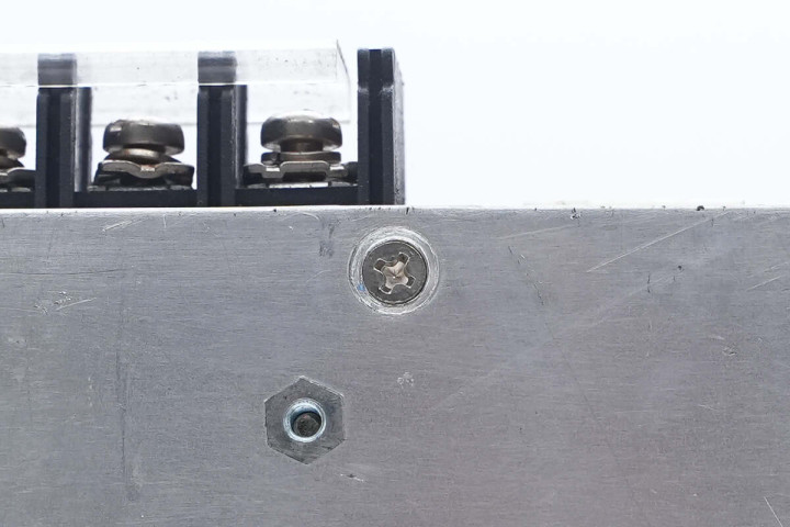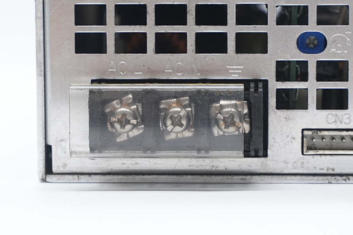 明纬这款开关电源采用铝合金外壳,通过螺丝固定,底部设有接线端子,在接线端子处粘贴信息标签。