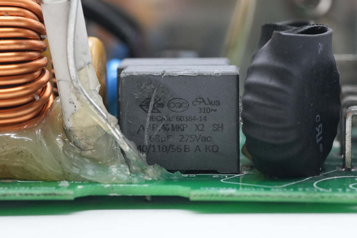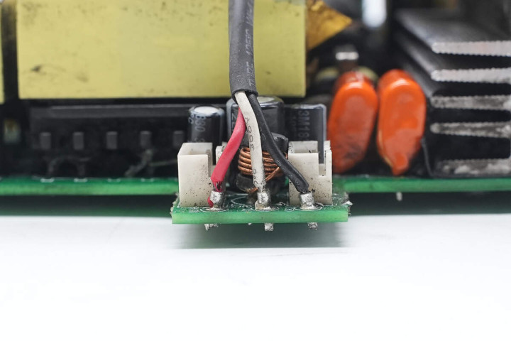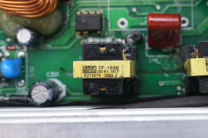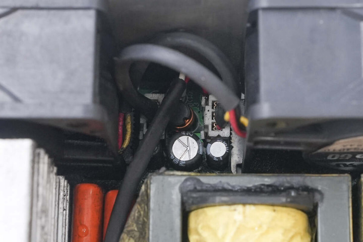 辅助电源芯片采用帕沃英蒂格盛TNY280PN,用于为散热风扇供电。整流管散热片设有温度开关用于过热保护,并设有铜排连接输出。电源内部电解电容全部为日系品牌,元件之间打胶加固,内部做工和用料扎实可靠。