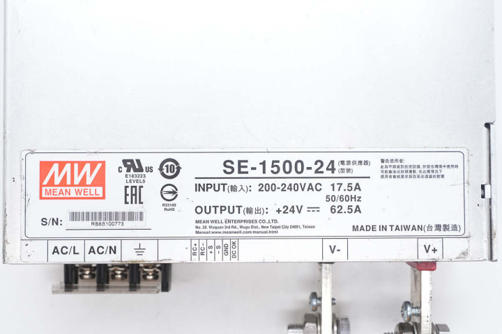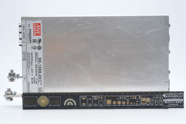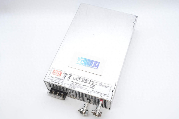 充电头网淘到了知名品牌明纬的一款1500W开关电源模块,电源型号为SE-1500-24,输入电压范围为200-240V,输出电压为24V,输出电流62.5A。电源采用铝合金外壳,内部设有散热风扇。