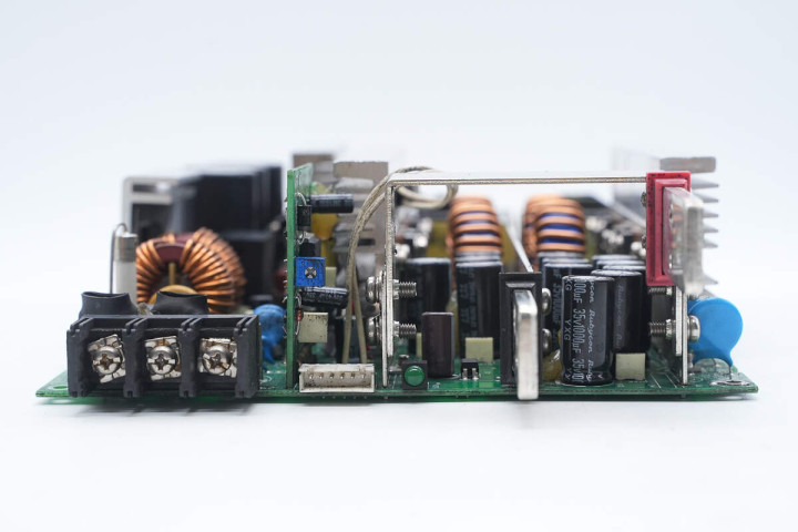 PCBA模块侧面一览,左侧设有交流接线端子,中间设有控制小板和控制端子,在控制小板上设有电位器,用于输出电压调节。右侧设有滤波电容和直流接线柱。