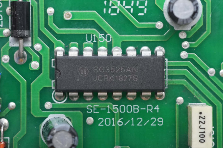 PWM控制器来自安森美,型号SG3525A,芯片内置电压基准,支持外部时钟同步,内置软启动电路,采用PDIP-16封装。
