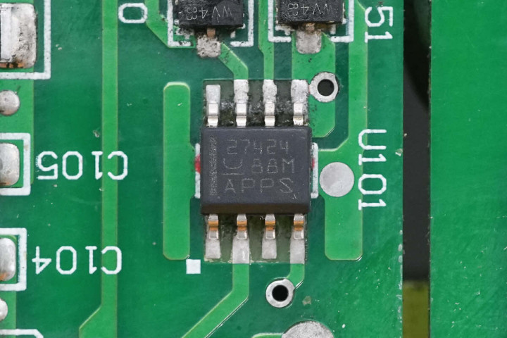 驱动器芯片来自德州仪器,型号UCC27424,是一款具备4A输出电流的双通道栅极驱动器,用于驱动隔离变压器,采用SOIC8封装。